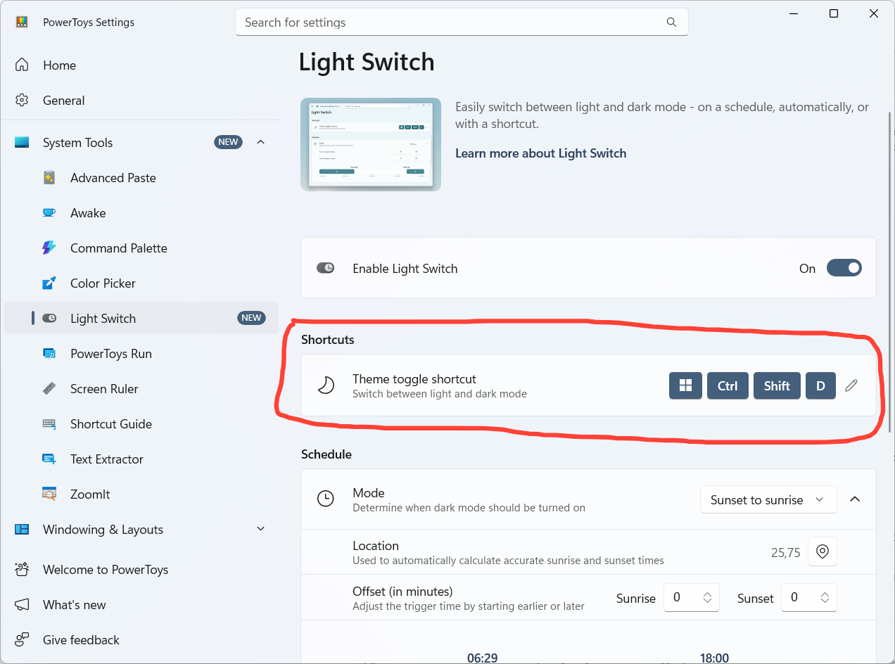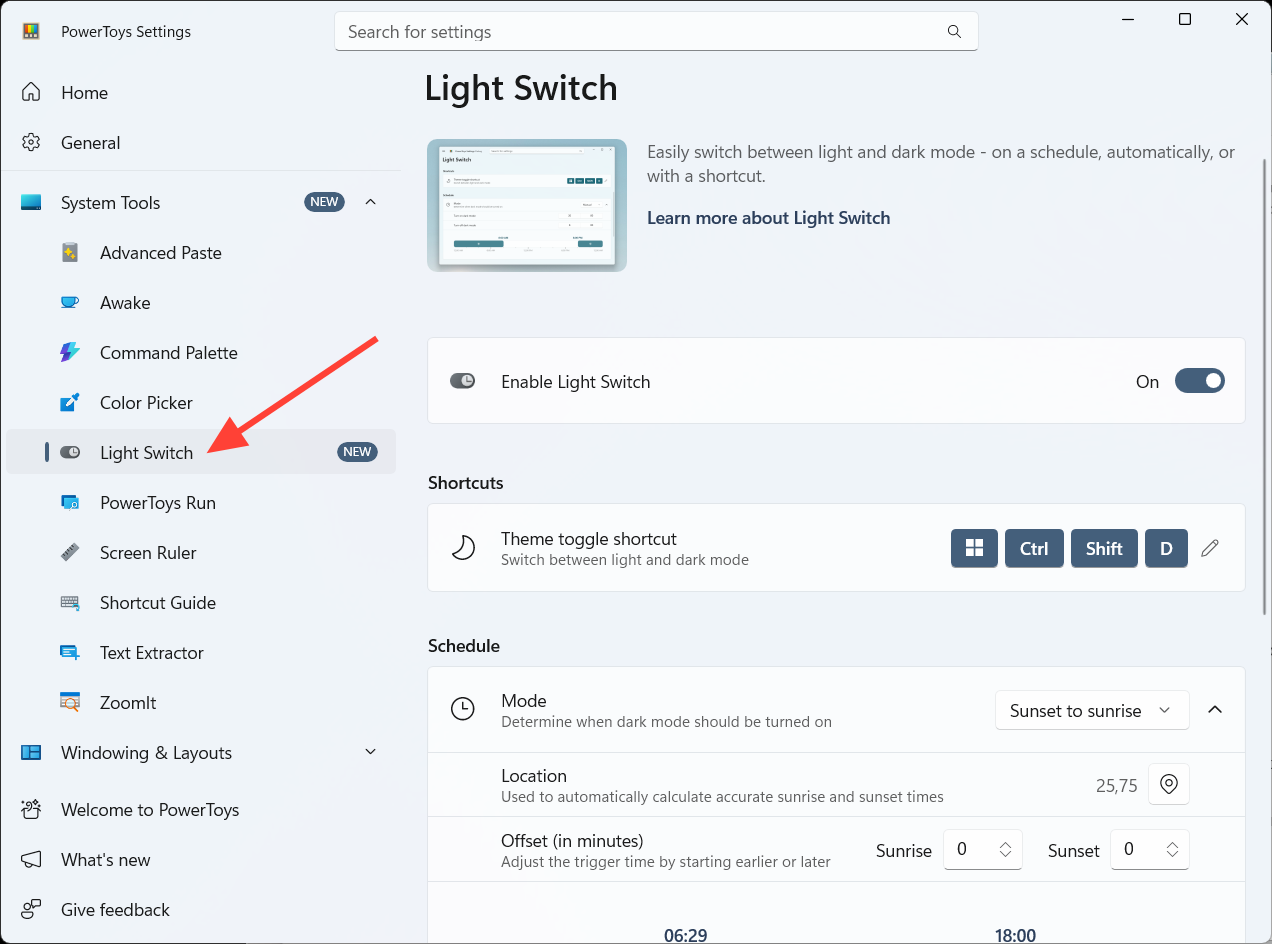 Light Switch is a PowerToys utility that automates switching between Windows light and dark modes. It can follow sunrise and sunset for your location or run on a schedule you define. You can also limit changes to the system UI, apps, or both, and trigger a manual toggle with a keyboard shortcut.
