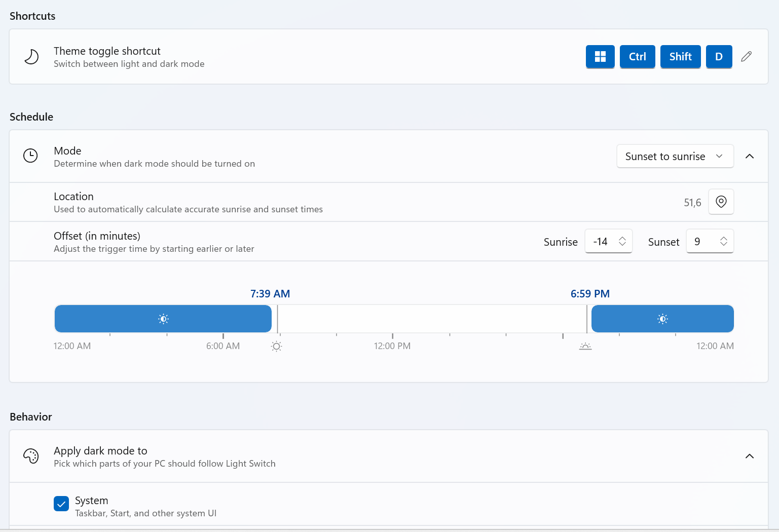 Set Light Switch once and let your PC adapt throughout the day. Start with automatic sunrise/sunset, add a few minutes of Offset if needed, and refine which areas (system or apps) should follow the schedule.