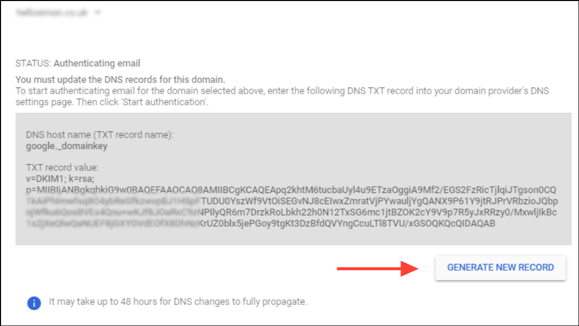 Step 3: Generate and add a DKIM record. DKIM attaches a digital signature to your emails, allowing recipients to verify that the message was not altered. If you use Google Workspace or another email provider, follow their instructions to generate a DKIM key. Add the provided TXT record to your DNS, typically under a selector such as google._domainkey or similar.