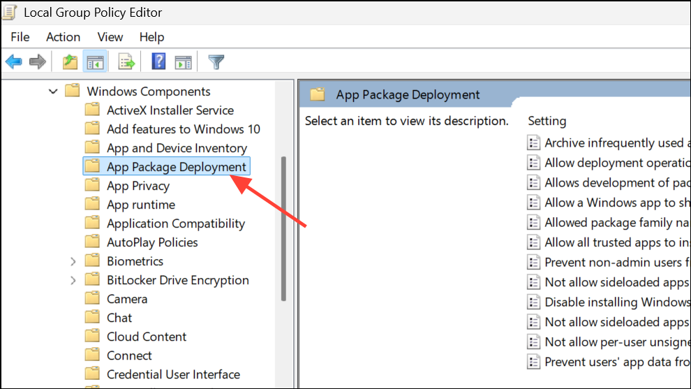 Step 2: In the left pane, navigate to Computer Configuration > Administrative Templates > Windows Components > App Package Deployment.