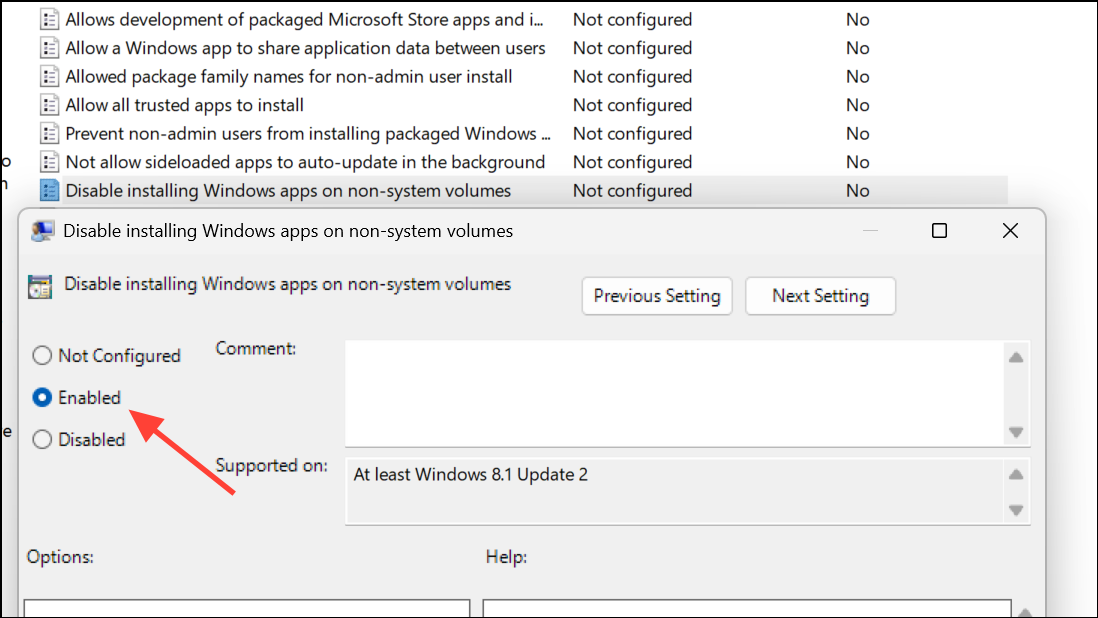 Step 4: Select Enabled to activate the restriction. This setting prevents users from installing or moving apps to drives other than the system drive.