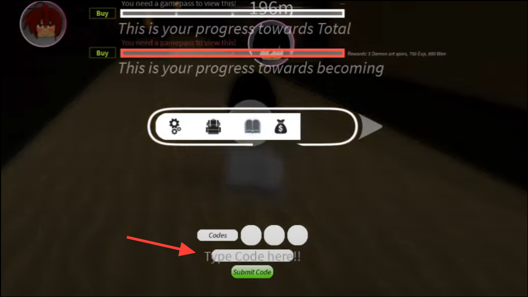 Step 2: Select the Book icon to open the page that contains Gamepasses and the code entry field.