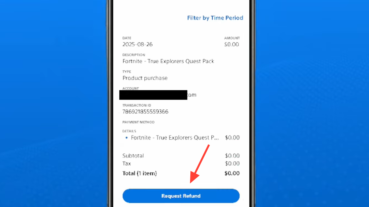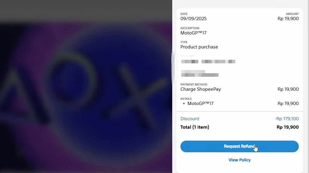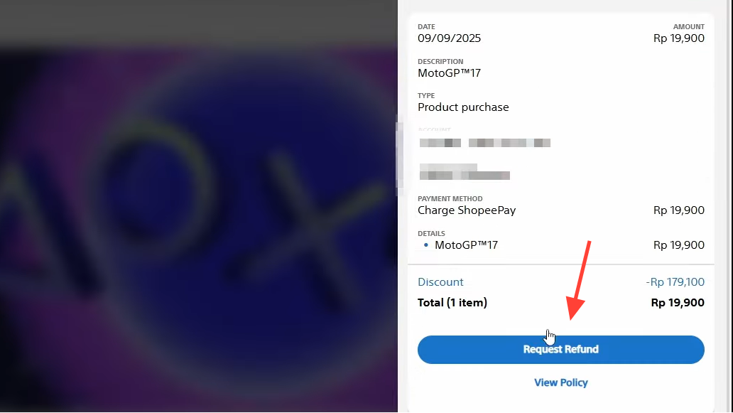 Step 5: On the transaction details page, look for the Request Refund option. If it appears, click it to move into the refund request flow. If it does not appear, the purchase is not eligible under the standard policy.