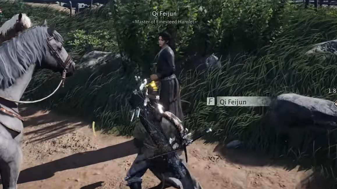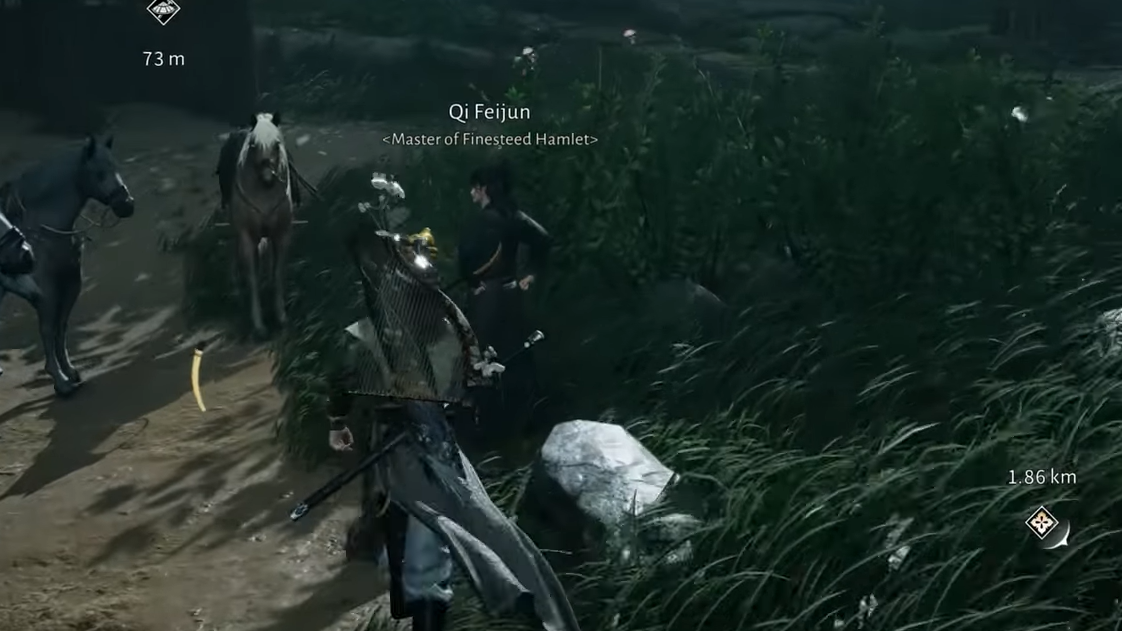 To begin the Wandering Tale, travel to Finesteed Hamlet using the closest teleport or landmark, then walk into the ranch area where the horses gather. During the day, Qi Feijun is usually near a small herd, recognizable as the ranch master who often appears to be muttering to his animals.