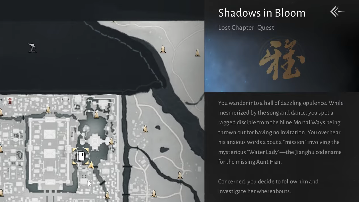 “Shadows in Bloom” is a Jianghu Legacy (Lost Chapter) quest that plays out entirely in Kaifeng, primarily across Velvet Shade’s Revelry Hall and Nimbus Tower. The through-line is simple: recover a Yin-Inscribed Booklet tied to Aunt Han’s List of Faceless Ones before the Jiangnan state can use it as a bargaining chip.