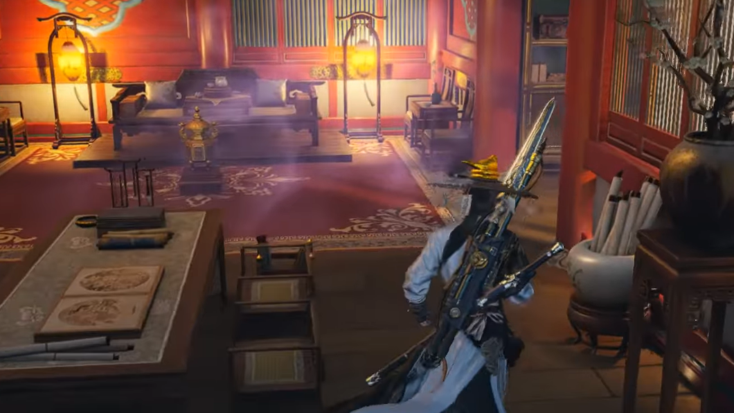 Step 4: Search the room and pick up the Yin-Inscribed Booklet from the table near the balcony, beside a mounted fan and the legendary scorched-tail guqin.