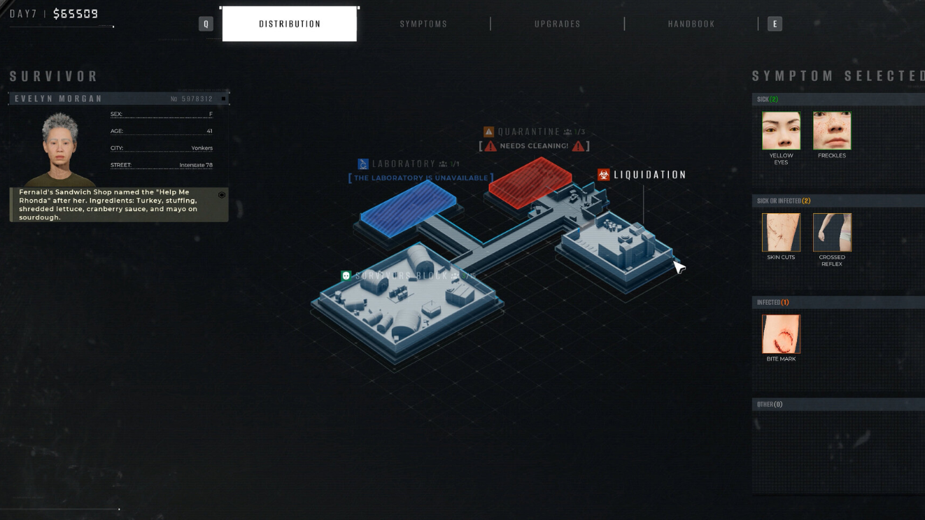 To keep quotas on track, consistent use of quarantine and the lab is essential. When you are unsure about someone, isolating and later researching them is almost always better than gambling and sending them to the truck or to their death. Upgrades that improve survivor capacity and inspection tools both make this more manageable.