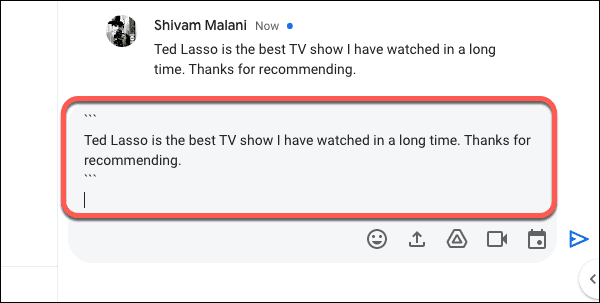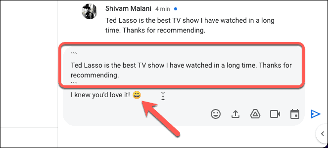 Step 7: When you're done, press Enter to send your message. The quoted messages will appear formatted as code blocks.