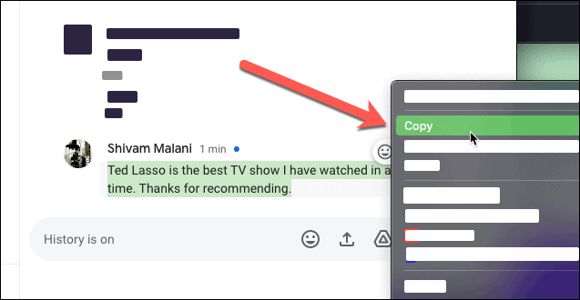 Step 1: Find the first message you want to quote. Double-click to select the text, right-click, and choose 'Copy' from the context menu.