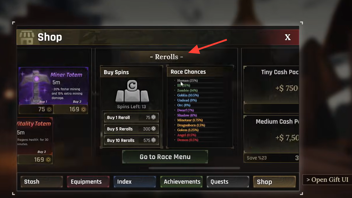 | 3 | Scroll through the shop slabs with your mouse wheel until you find the one labeled Rerolls. | A slab with reroll-related options, including Race, is highlighted. |