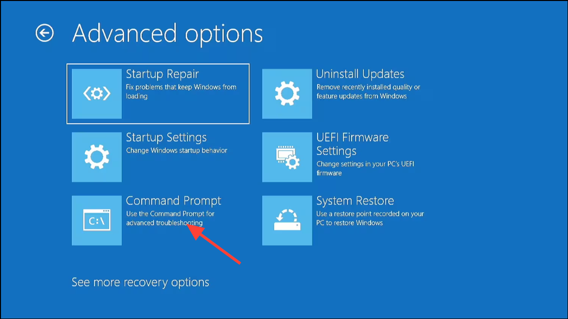 Step 1: Boot into the Windows Recovery Environment. If Windows cannot start, use a bootable USB or DVD with Windows 11 installation media. On the initial setup screen, press Shift + F10 to open Command Prompt, or navigate through Troubleshoot > Advanced Options > Command Prompt.
