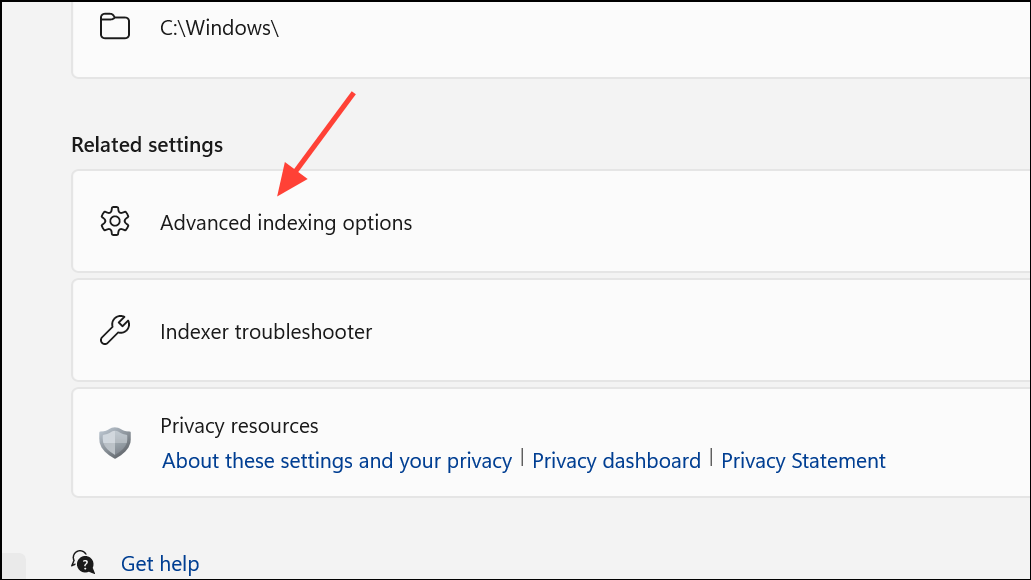 Step 2: Scroll down and click Advanced indexing options under the Related settings section. This opens the classic Indexing Options dialog.
