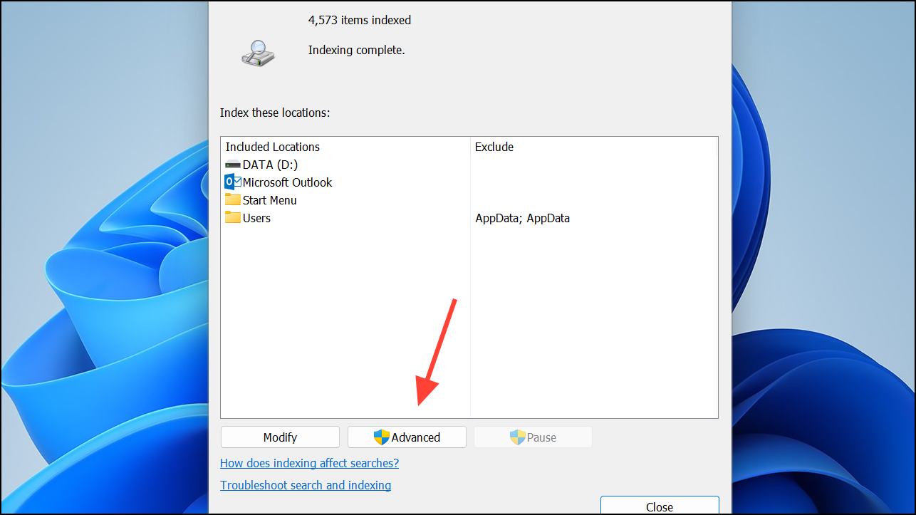 Step 3: Review the included locations in the Indexing Options window. If needed, modify them after the rebuild completes to suit your workflow.