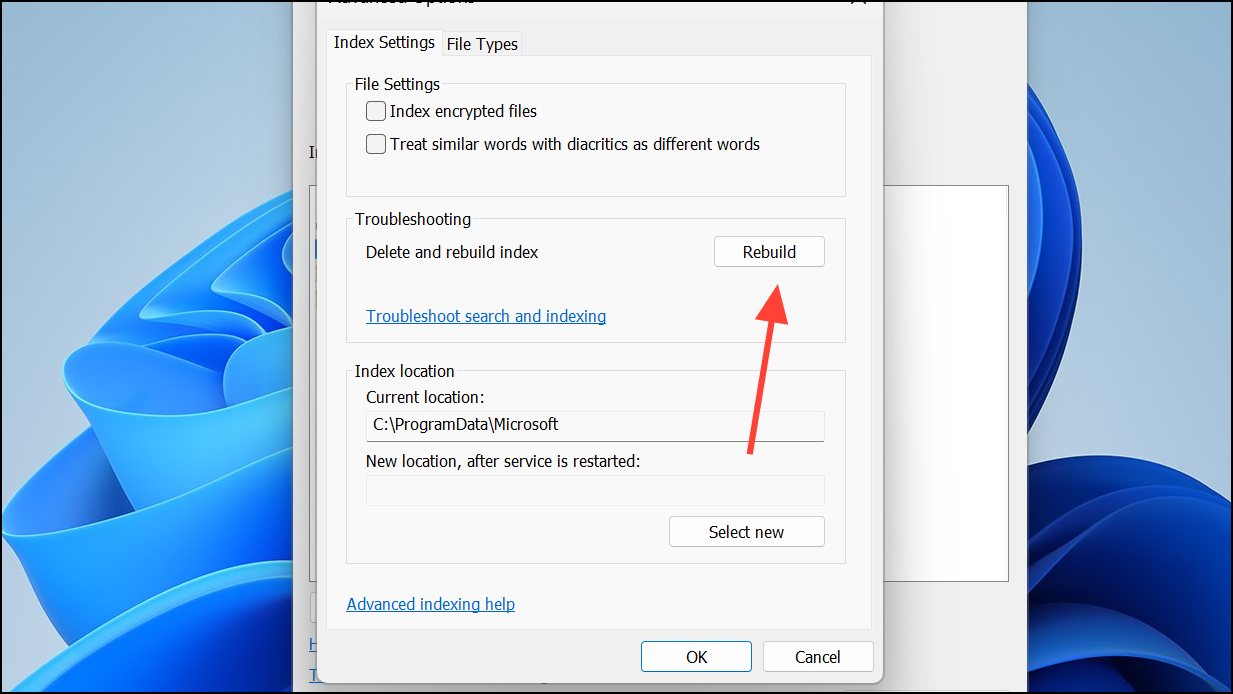 Step 4: In the Advanced Options dialog, switch to the Index Settings tab. Under the Troubleshooting section, click Rebuild. Windows will warn that rebuilding the index may take a long time and search results may be incomplete until the process finishes. Click OK to confirm.