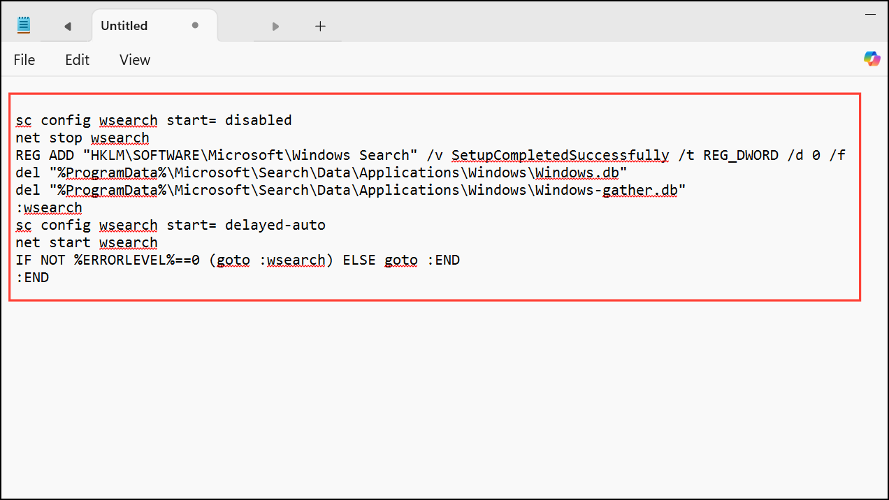 Step 2: Save the file as reset_and_rebuild_search_index.bat. Run it with administrator privileges. The script resets the indexed locations in the registry, deletes the index database, and restarts the search service. Windows will now use default index locations and begin rebuilding.