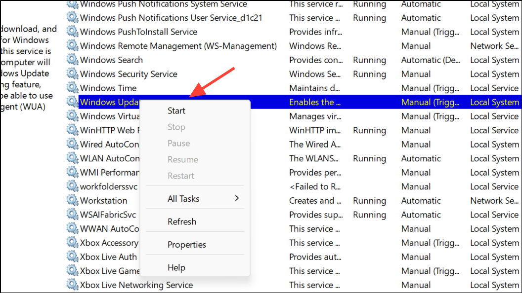 Step 4: Return to the Services window, right-click Windows Update, and select Start to resume update services. This method is safe and does not affect your ability to boot or use Windows, but it will remove uninstalled update files, requiring Windows to redownload them if needed.