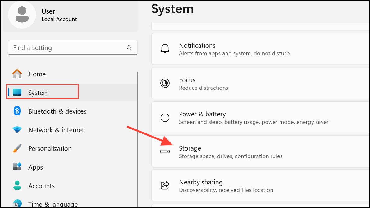 Step 1: Open the Settings app by pressing Windows + I or selecting it from the Start menu. Navigate to System and then click on Storage. The Storage section provides an overview of disk usage and options for managing files.