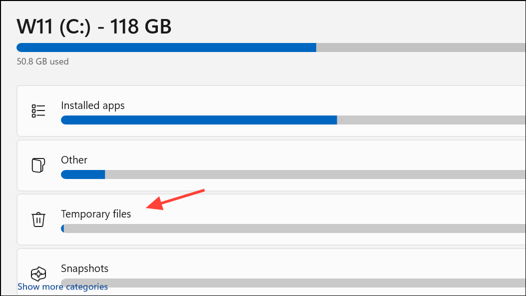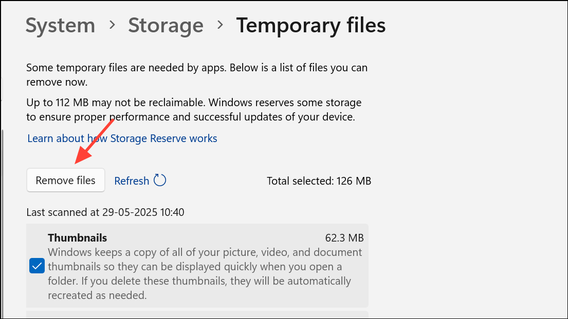 Step 2: On the right side, select Temporary files. Windows will scan your drive for files that can be safely removed, including old installation files, temporary system data, and cached items.