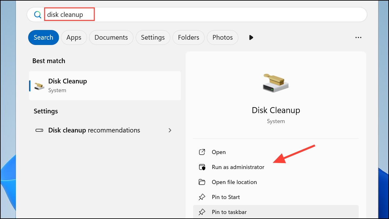 Step 1: Open the Start menu, type Disk Cleanup, right-click the result, and select Run as administrator. This ensures the tool can access protected system files.