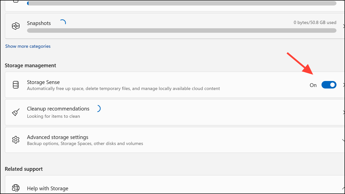 Step 1: Open Settings and go to System > Storage. Scroll down and enable Storage Sense. This feature automates disk cleanup by removing temporary files, emptying the Recycle Bin, and deleting old system files at regular intervals.