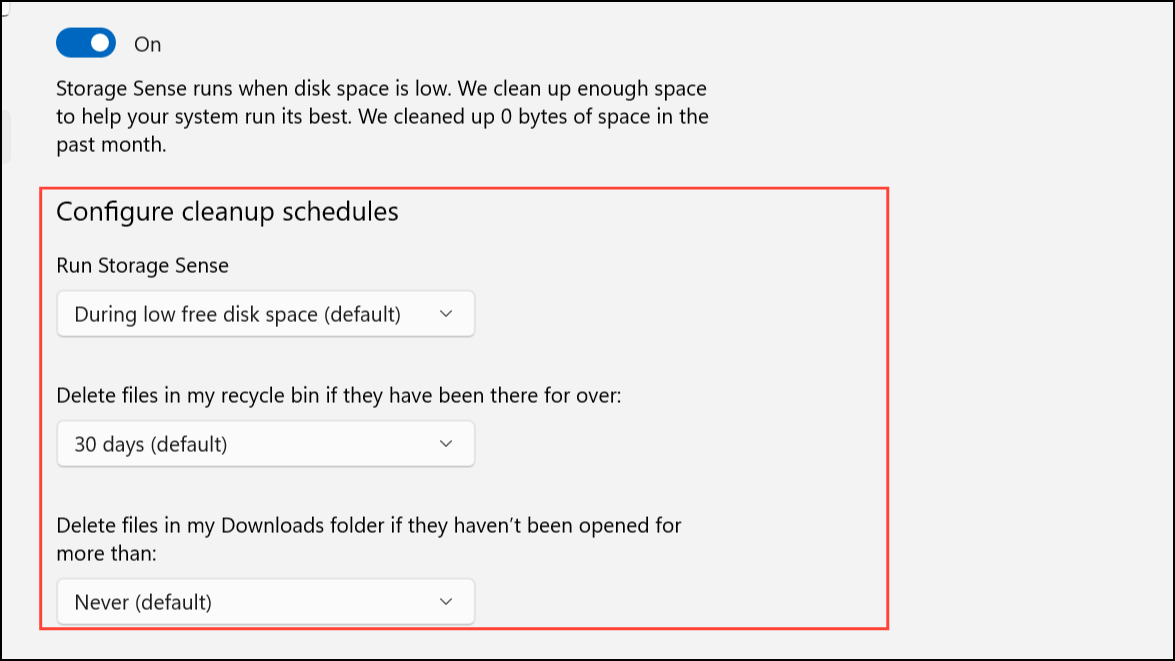 Step 2: Click on Storage Sense to adjust its configuration. You can set how often it runs, how long files stay in the Recycle Bin before removal, and whether it deletes files in the Downloads folder. Storage Sense will also handle old Windows installation files if they are eligible for deletion.