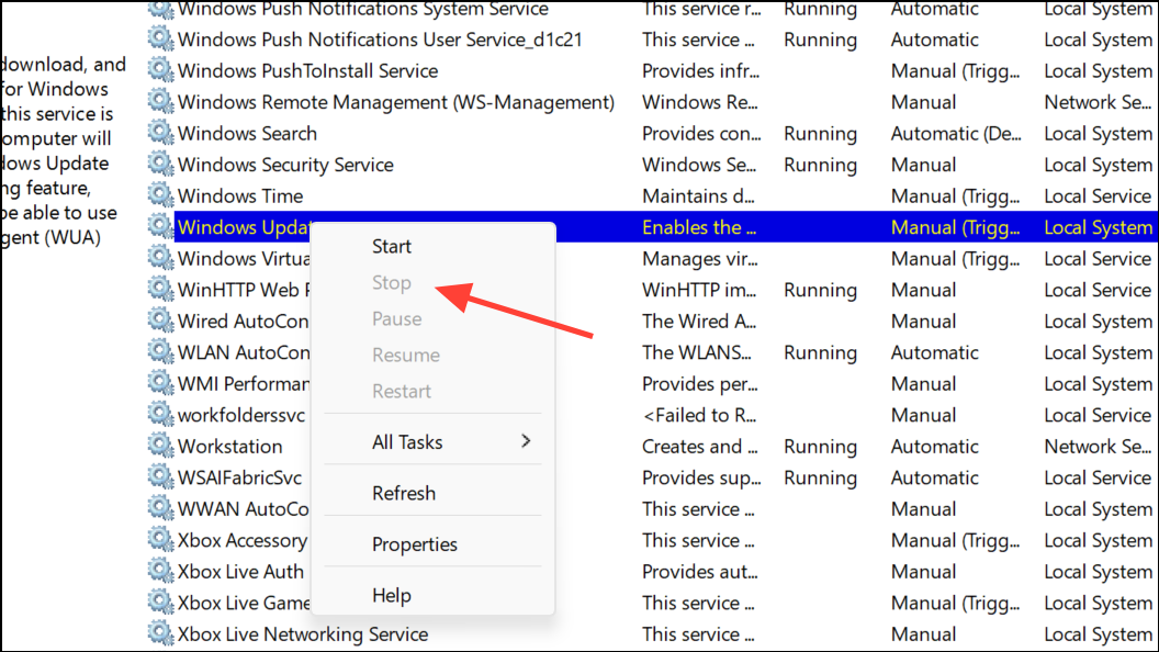 Step 2: In the Services window, find Windows Update, right-click, and select Stop.
