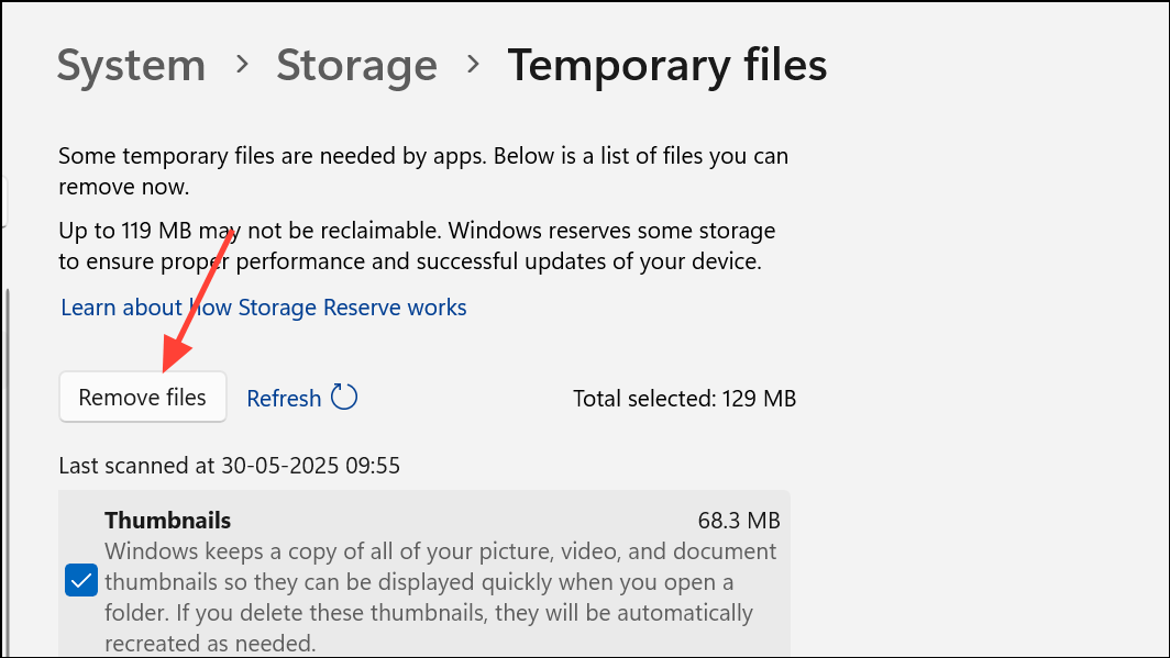Step 2: Under the Storage section, click on Temporary files. Windows will automatically scan and display a list of temporary file categories, such as Delivery Optimization Files, Thumbnails, Windows Update Cleanup, and Recycle Bin contents.