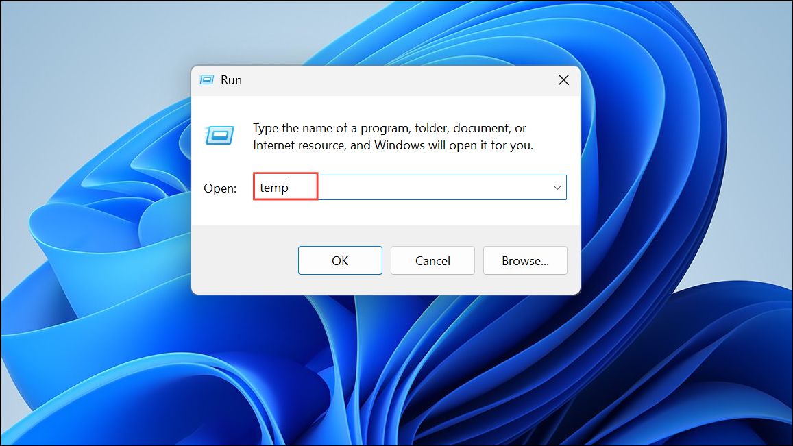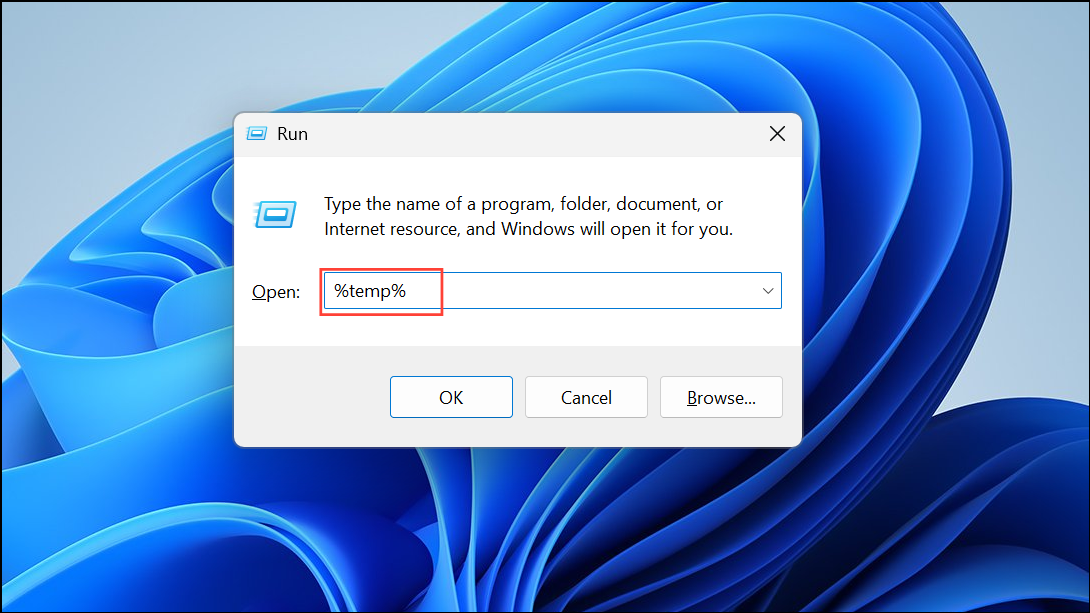 Step 1: Press Windows + R to open the Run dialog. Type %temp% and press Enter. This opens the user-specific Temp folder in File Explorer.
