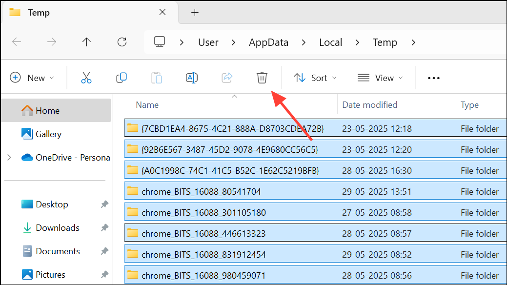Step 2: Press Ctrl + A to select all files and folders inside. Press Delete on your keyboard. If prompted that certain files are in use, skip them—these are locked by active processes and can be deleted during a future cleanup.