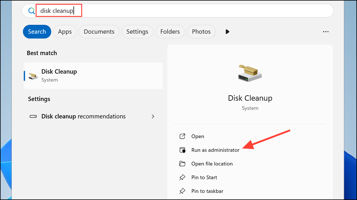 Step 1: Press Windows + S and type disk cleanup. Click on the Disk Cleanup app and select Run as administrator for a more thorough scan.