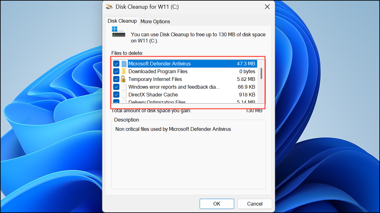 Step 3: Review the list of file categories. Check the boxes for Temporary files, Thumbnails, Delivery Optimization Files, and any other types you wish to remove. Click OK, then confirm by clicking Delete Files.
