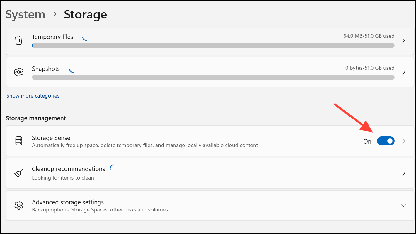 Step 1: Navigate to Settings > System > Storage. Toggle Storage Sense to On.