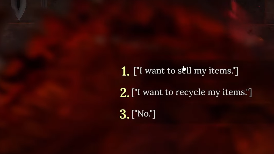 Step 2: Interact with the NPC to open the dialogue. Choose the option related to recycling, not the one that only sells items. With Wo, this is the second dialogue choice.