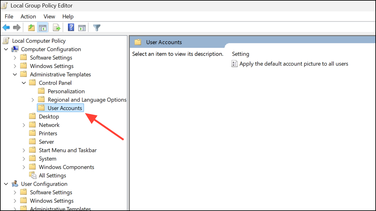 Step 6: Go to Computer Configuration > Administrative Templates > Control Panel > User Accounts. Find the policy ‘Apply the default account picture to all users’ and set it to ‘Enabled’ to force the use of your transparent image for all accounts.