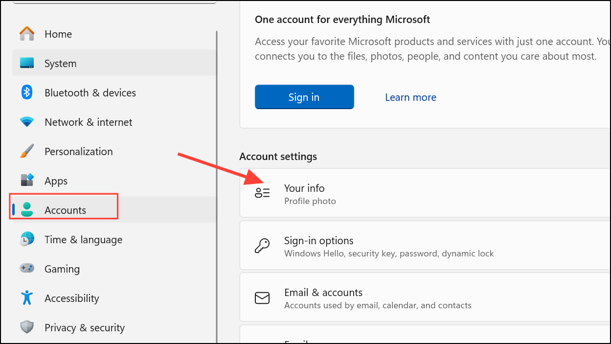Step 1: Open the Settings app (Windows key + I), then go to Accounts > Your info.