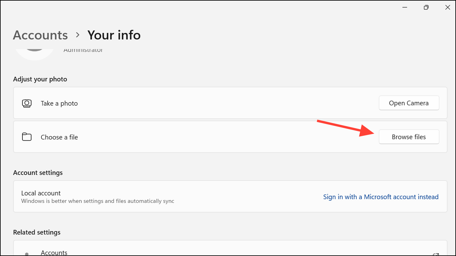 Step 3: Go to Settings > Accounts > Your info, select Browse files in the Choose a file section, and choose the default image you copied.