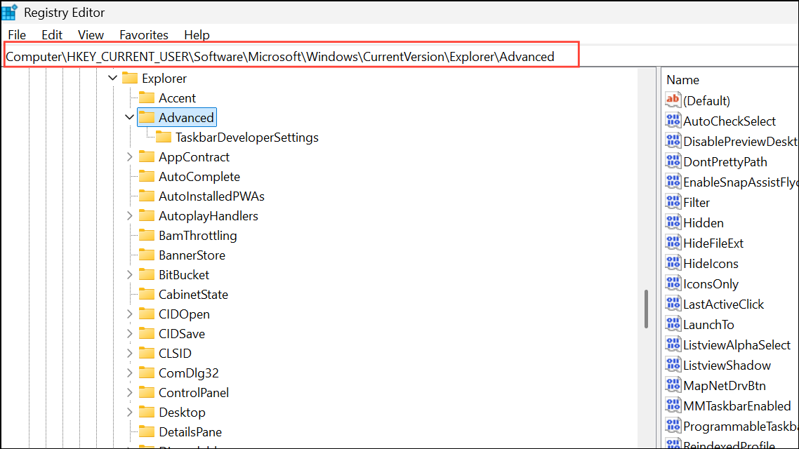 HKEY_CURRENT_USER\Software\Microsoft\Windows\CurrentVersion\Explorer\Advanced