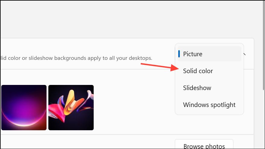 Step 2: In the left sidebar, click Background. Under Personalize your background, choose Solid color from the dropdown.