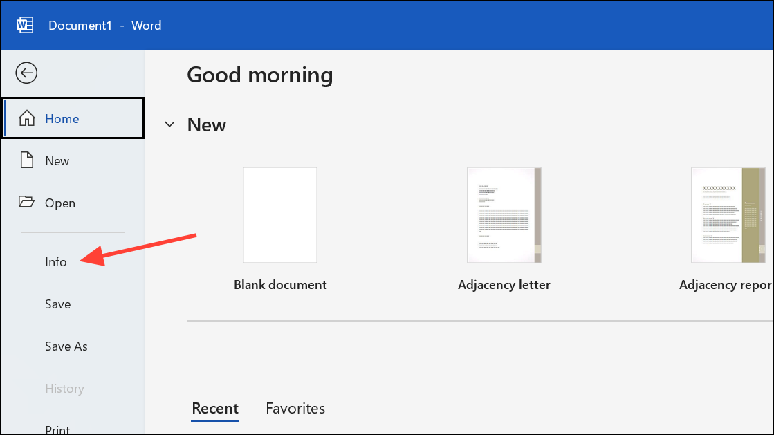 Step 1: Open your Word document and go to the File tab. Select Info.