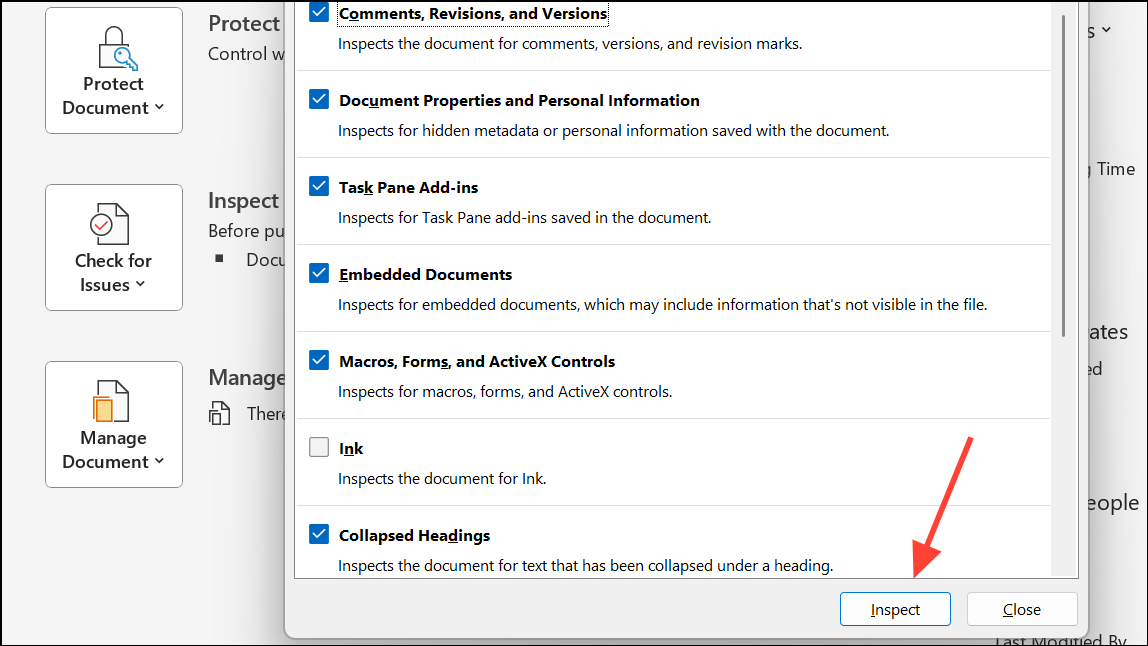 Step 4: The Document Inspector dialog box will appear. Here, you can select the types of content you want to inspect, such as comments, document properties, personal information, headers, footers, and custom XML data. Select the relevant checkboxes and click Inspect.