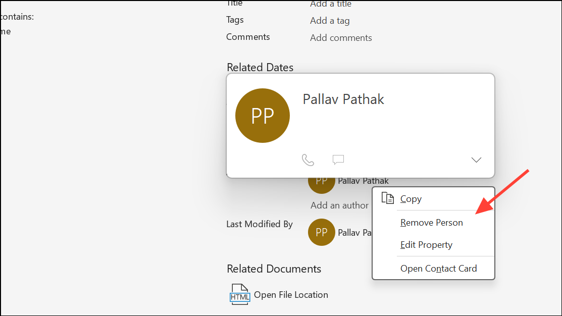 Step 2: In the Related People section on the right, you’ll see the author’s name. Right-click on the name and choose Remove Person. This deletes the author’s name from the document’s visible metadata.