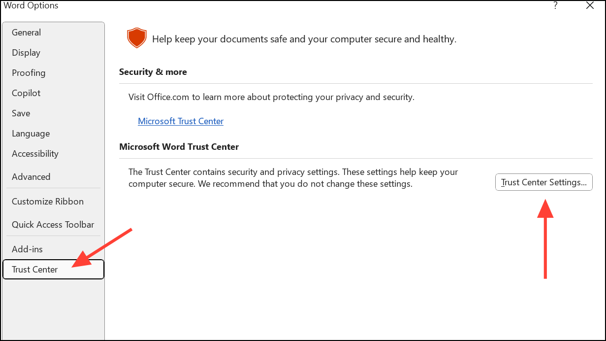 Step 2: In the Word Options dialogue box, click Trust Center on the left. Then click the Trust Center Settings button on the right.