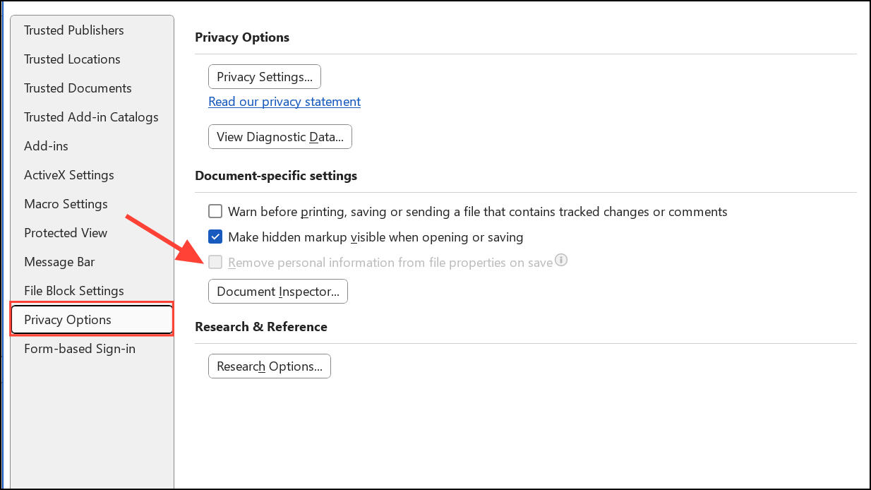 Step 3: Click Privacy Options on the left and then check the Remove personal information from file properties on save o