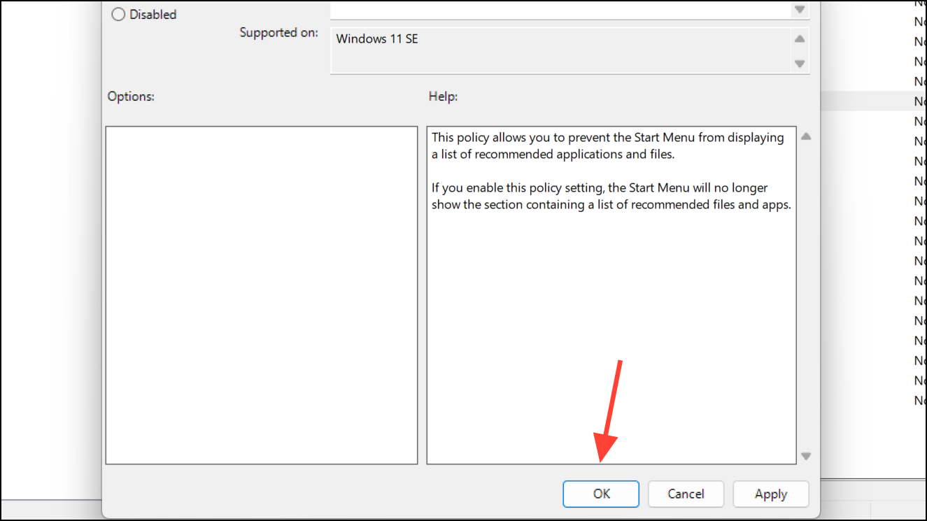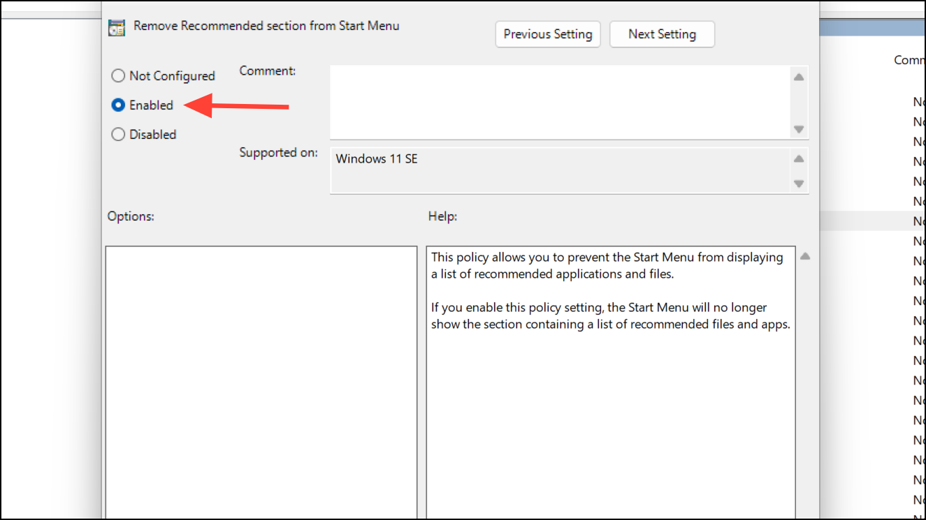 If you are not on Windows 11 SE, the policy might not take effect. In that case, try Method 2 or Method 3 below.