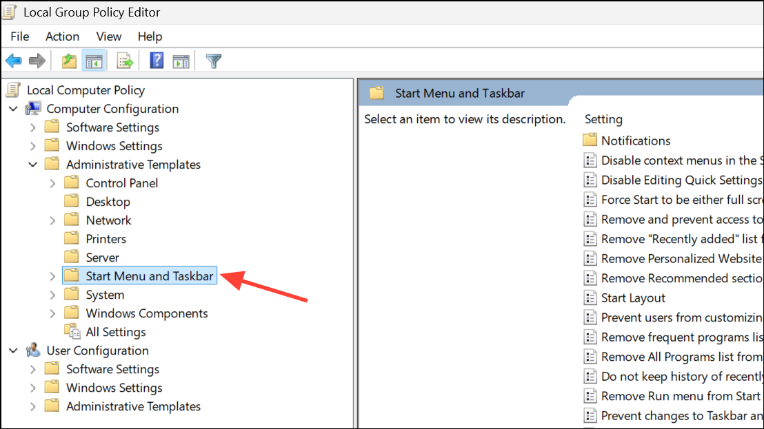 Step 3: Navigate to Computer Configuration > Administrative Templates > Start Menu and Taskbar.