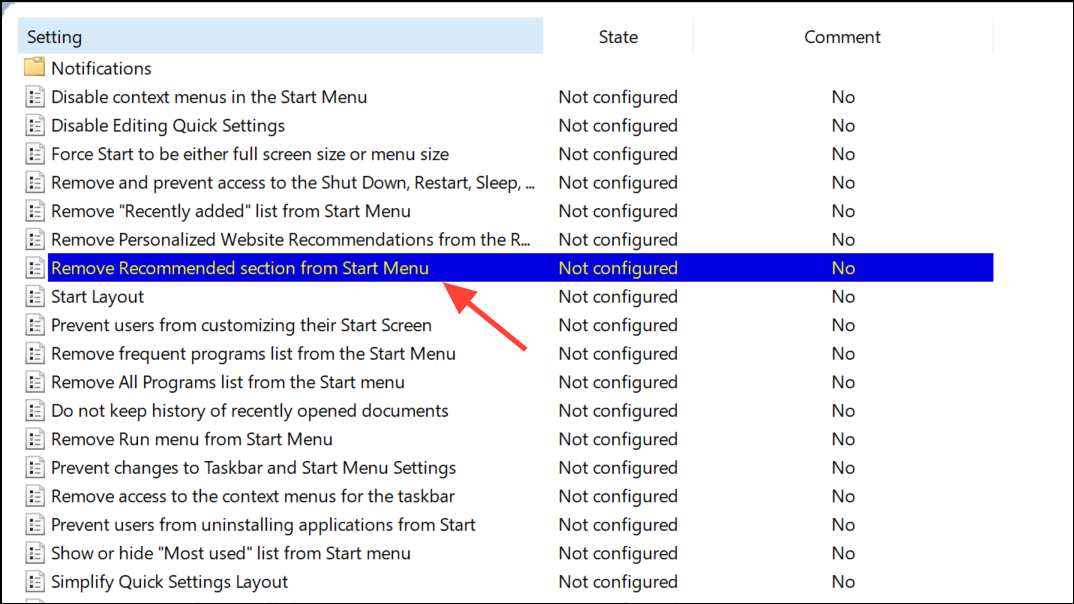 Step 4: Double-click Remove Recommended section from Start Menu.
