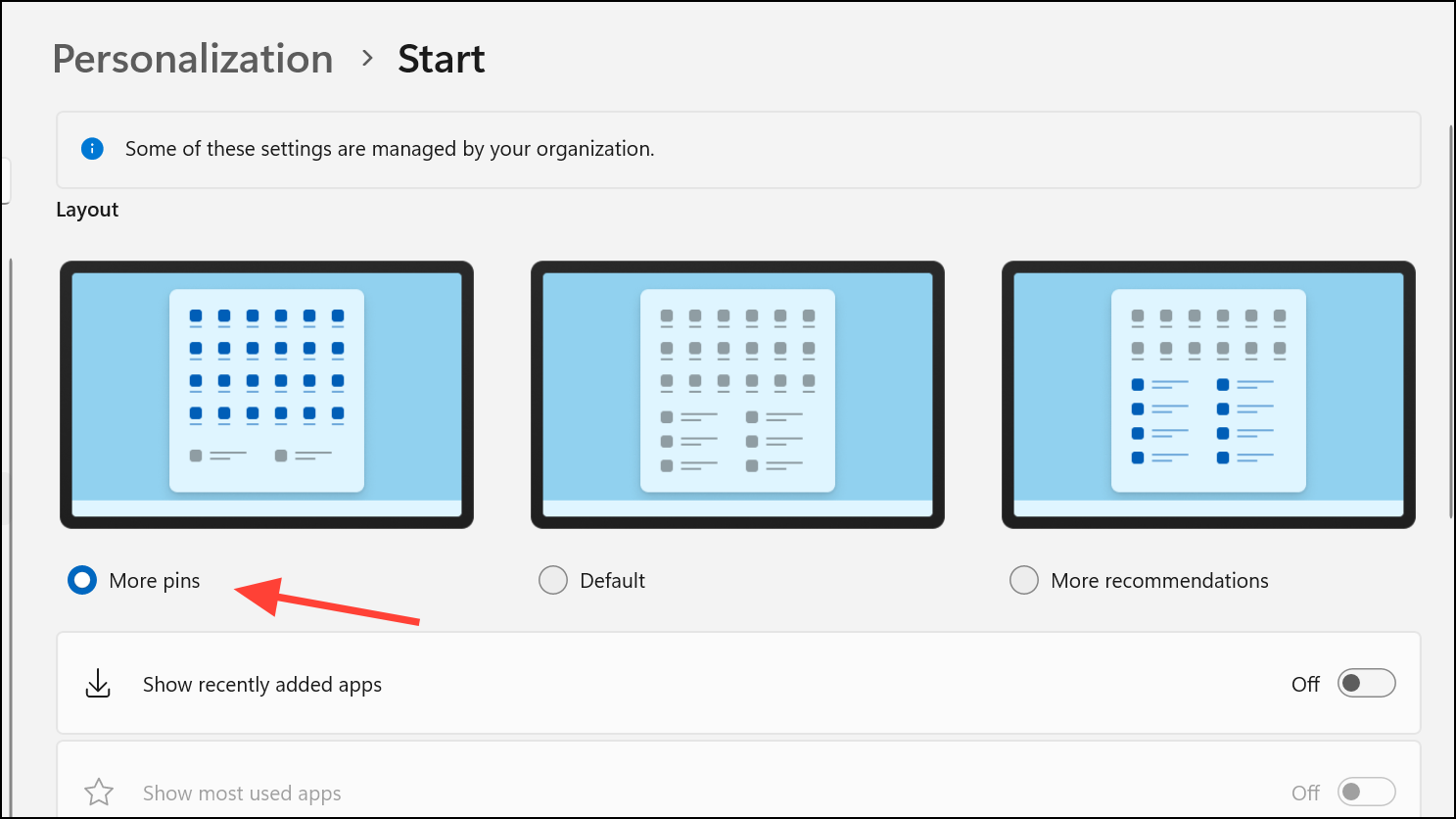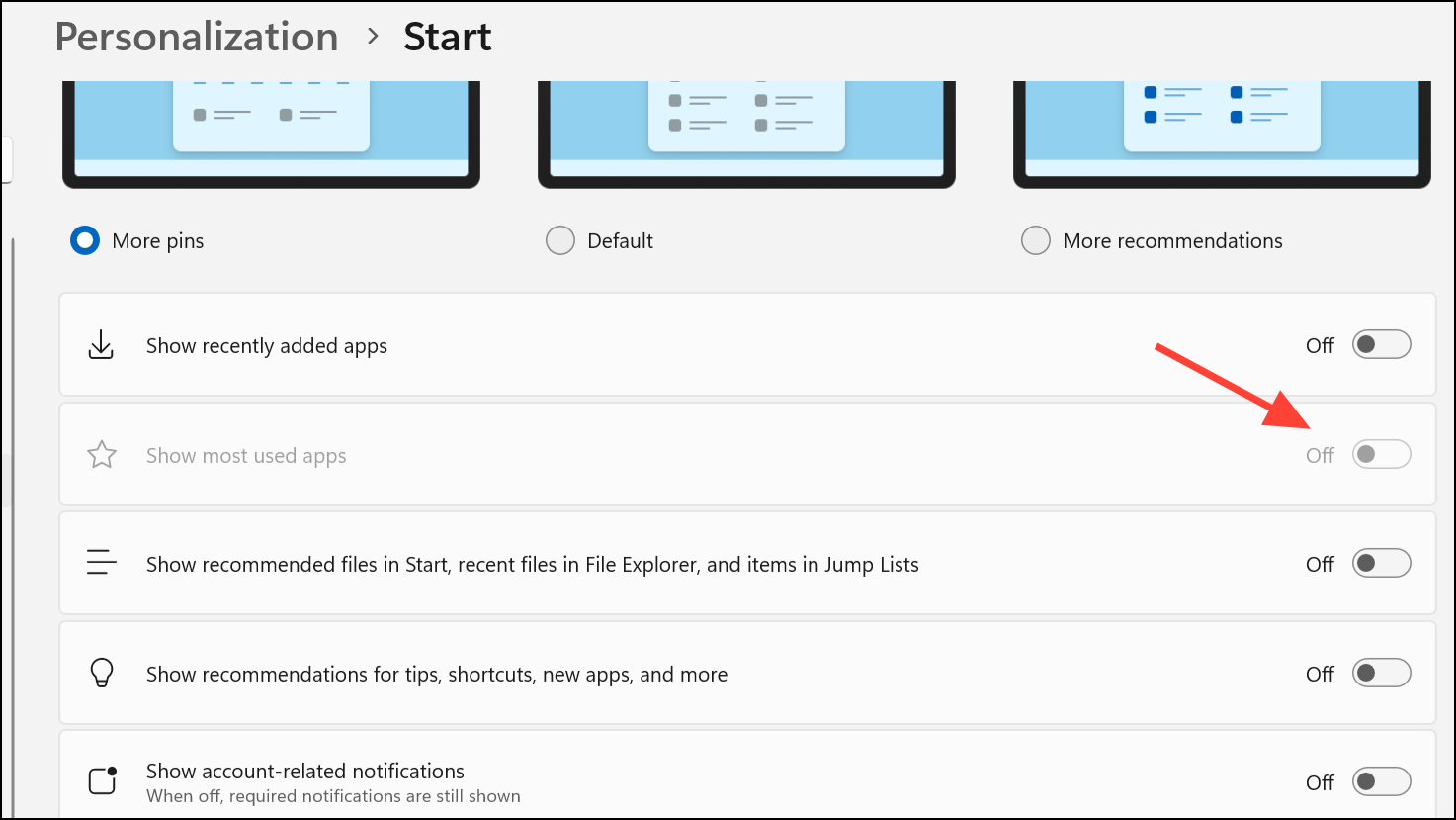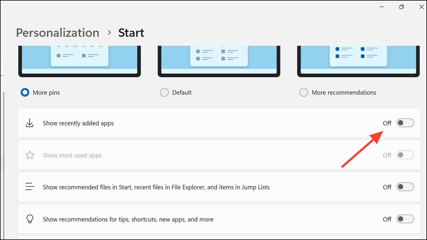 This configuration immediately stops new suggestions and reduces the height reserved for Recommended, improving how many pinned apps you see without scrolling. The empty space and “Recommended” label may still appear.