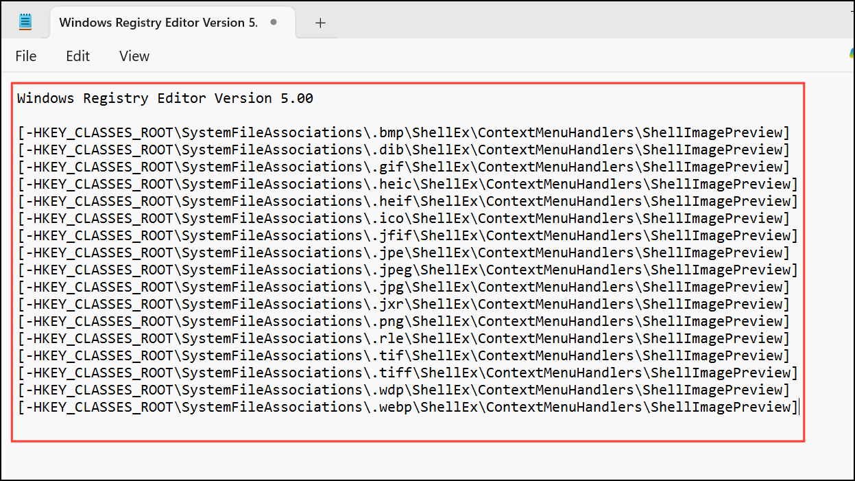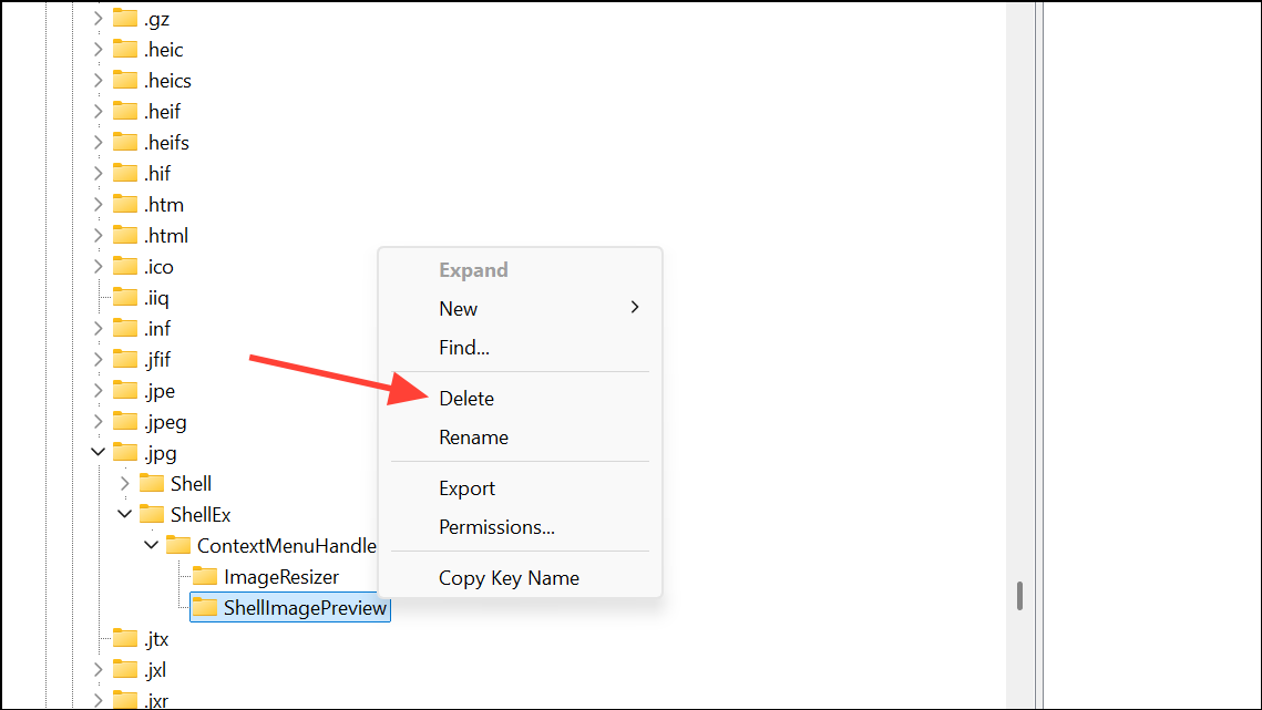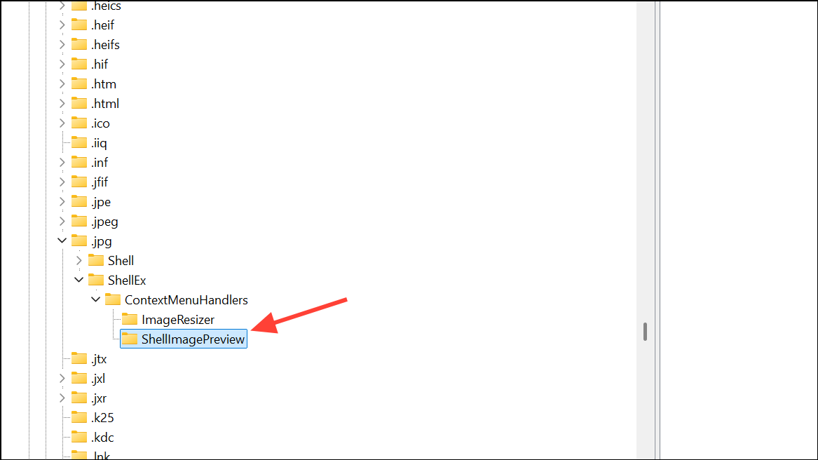 Step 5: Repeat Steps 2–4 for any other image file types you want to affect. Common extensions include .bmp, .png, .gif, .tiff, .heic, and others. Navigate to each key and remove the ShellImagePreview subkey as needed.
