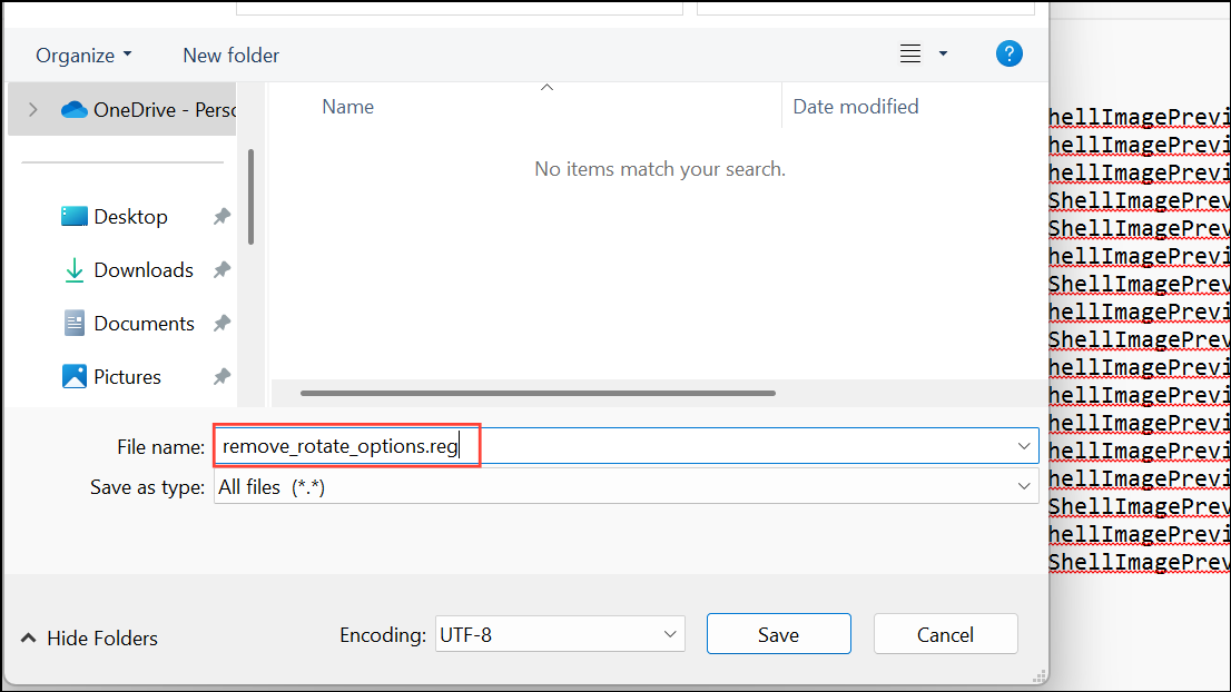 Step 2: Save the file with a .reg extension, such as remove_rotate_options.reg. In the Save dialog, ensure Save as type is set to All Files so the extension is correct.