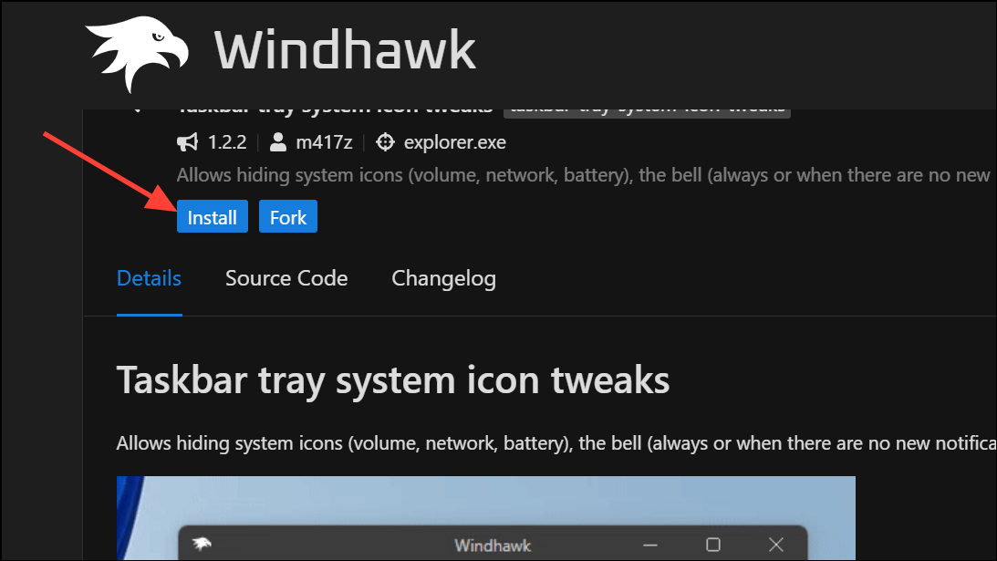 Step 2: Launch Windhawk and navigate to the “Explore” section in the upper-right corner. In the search bar, type Taskbar tray system icon tweaks and select the mod by that name.